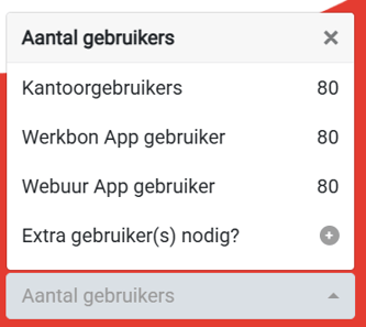 Hier zie je het actuele aantal actieve gebruikers voor jouw modules en extra onderdelen binnen Cafca Cloud. Heb je meer gebruikers nodig? Klik op het + teken bij ‘Extra gebruiker(s) nodig? ’ en stuur je aanvraag door via e-mail. Wij zorgen voor een snelle verwerking.
